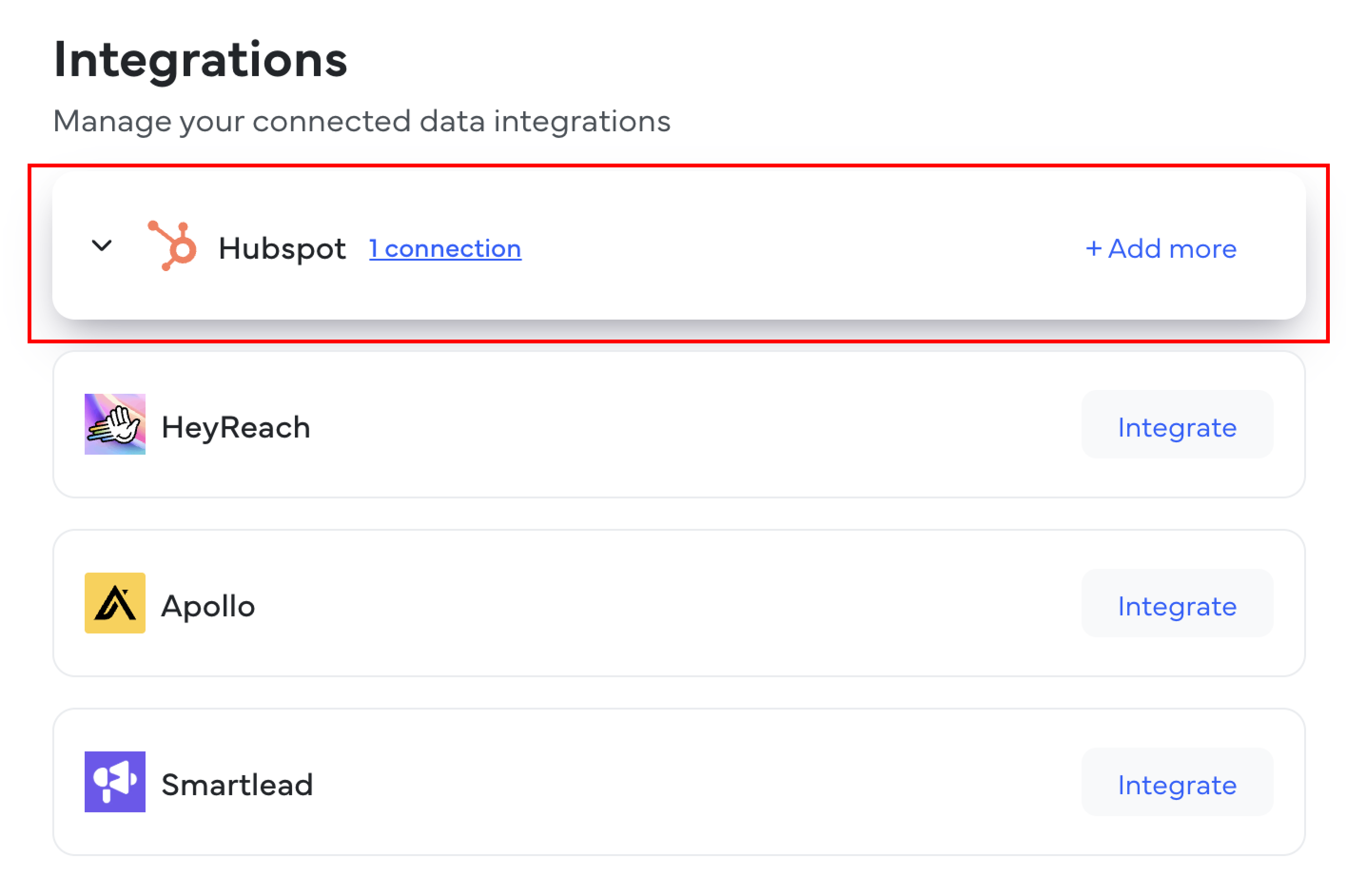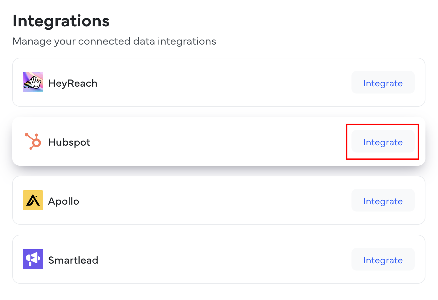 Step 2: On the Integrations page, locate the HubSpot card and click on Integrate